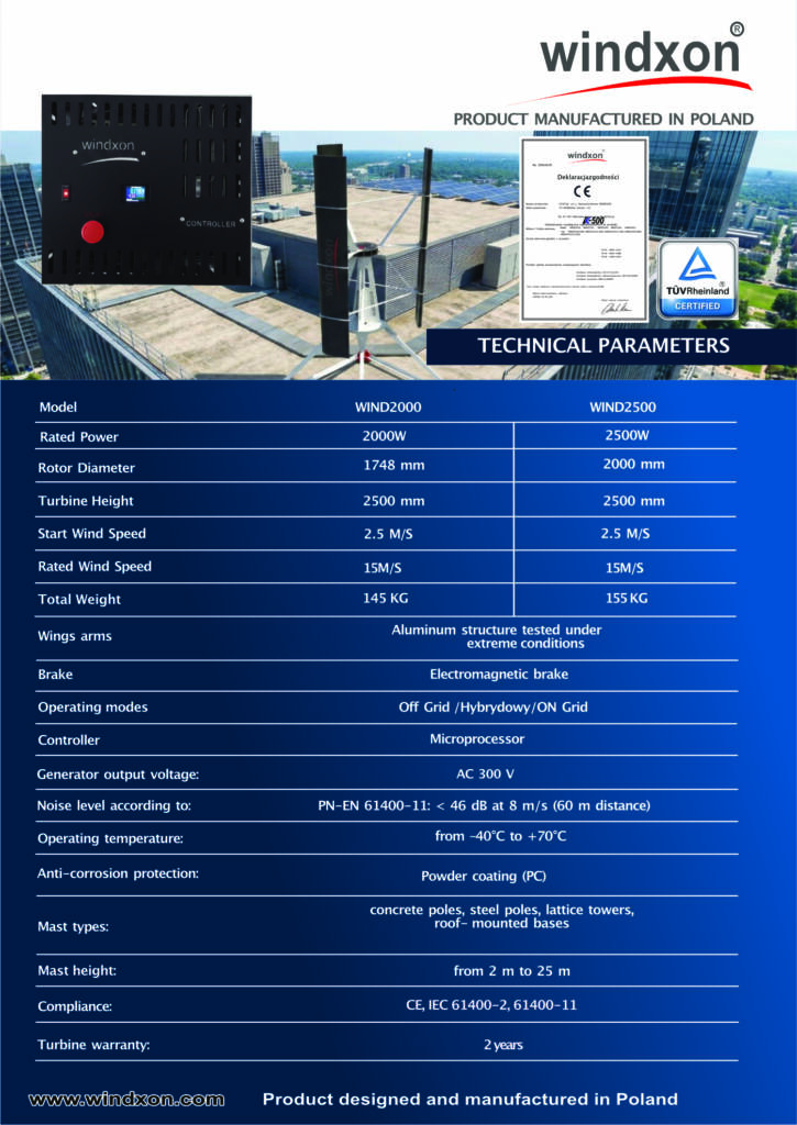 The WIND2000 / WIND2500 series are modern, quiet, and efficient vertical-axis wind turbines (VAWT), designed for homes, businesses, and farms.